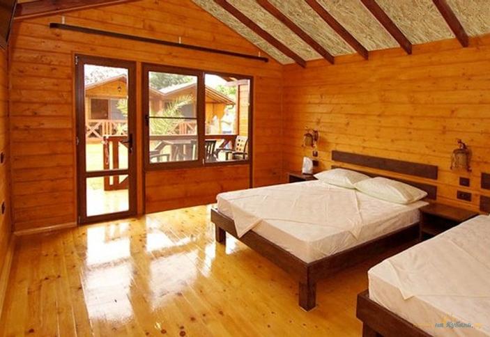 Двухместный домик с дополнительным местом. В номере: кровать двуспальная, прикроватные тумбочки, кондиционер, телевизор, холодильник. Санузел с душем.