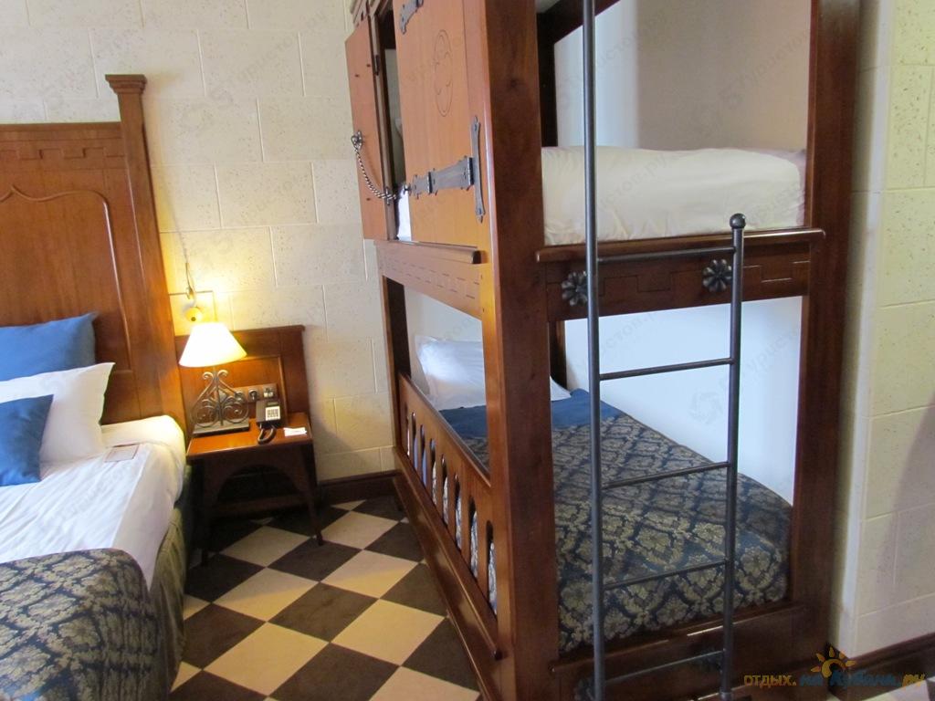 Богатое убранство комнат, где красное дерево изящных кресел, диванов и кроватей сочетается с плотной бордовой тканью портьер и покрывал, мягкие, поглощающие шум шагов, полы, декорированные под старинный дикий мрамор, живопись на каменных стенах с сюжетами из жизни королей, – все это довершает картину средневековья.