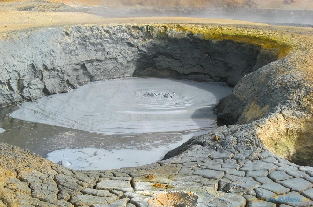 Обычно экскурсоводы ведут группу к середине сопки и уже там предлагают принять грязевую ванну, но мы советуем вам еще на подъеме свернуть налево: там есть большой (где-то 4-х метров в диаметре) кратер с удобным спуском, в котором можно поплавать. До дна достать там не пытайтесь. Впрочем, это у вас вряд ли получится. Дело в том, что грязь сама будет выталкивать вас наружу. Так что, умеешь или не умеешь плавать – в грязевой ванне не утонешь.